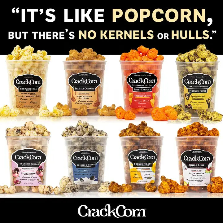 Crack Corn is like popcorn, but there are No Kernels and No Hulls. That means nothing gets stuck in your teeth. And they taste amazing! Available in over 10 incredible flavors.