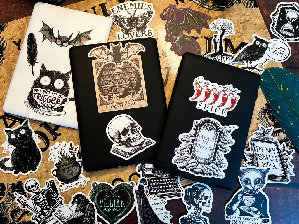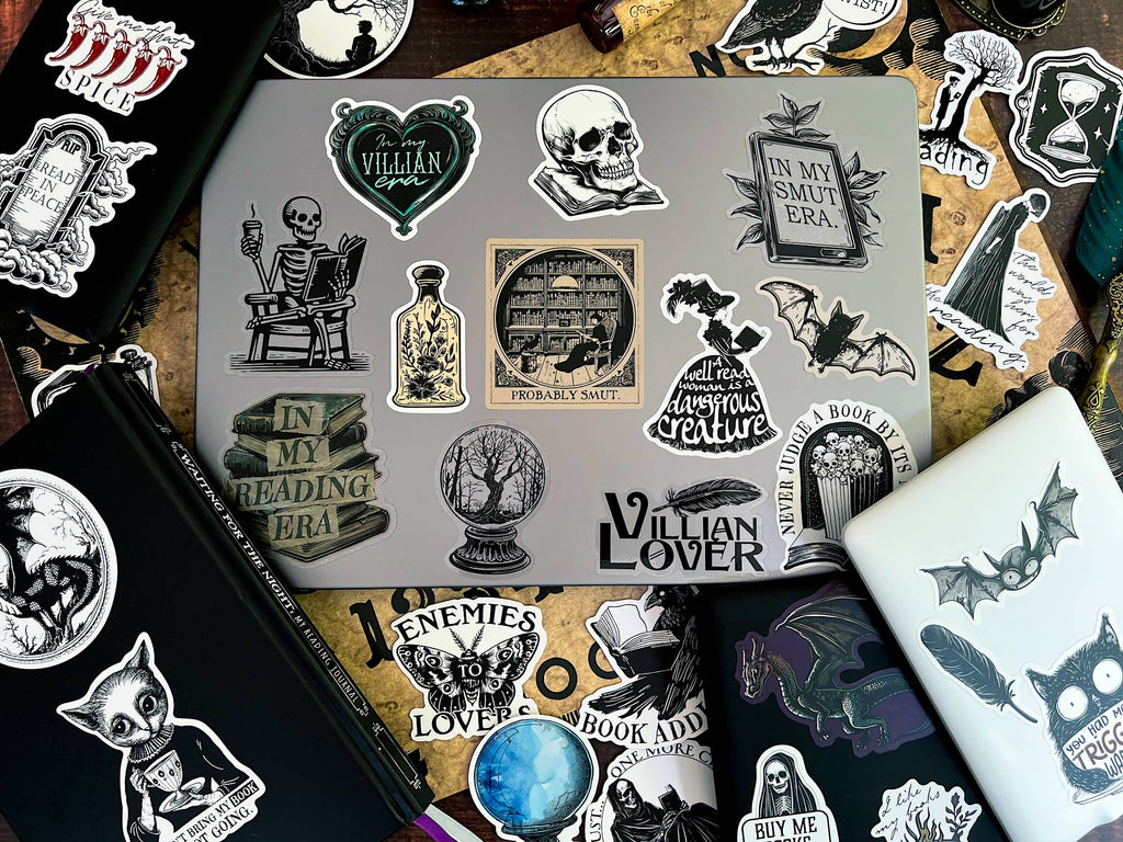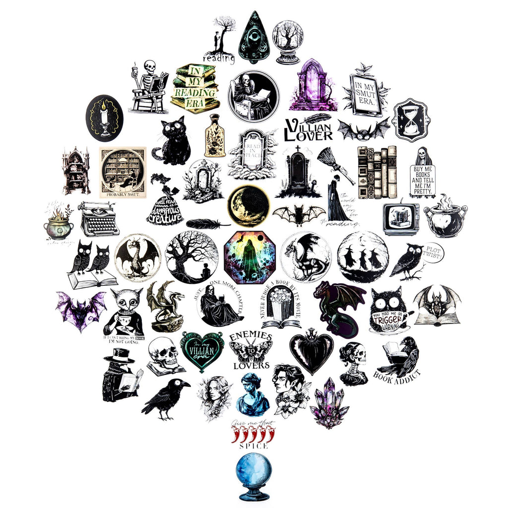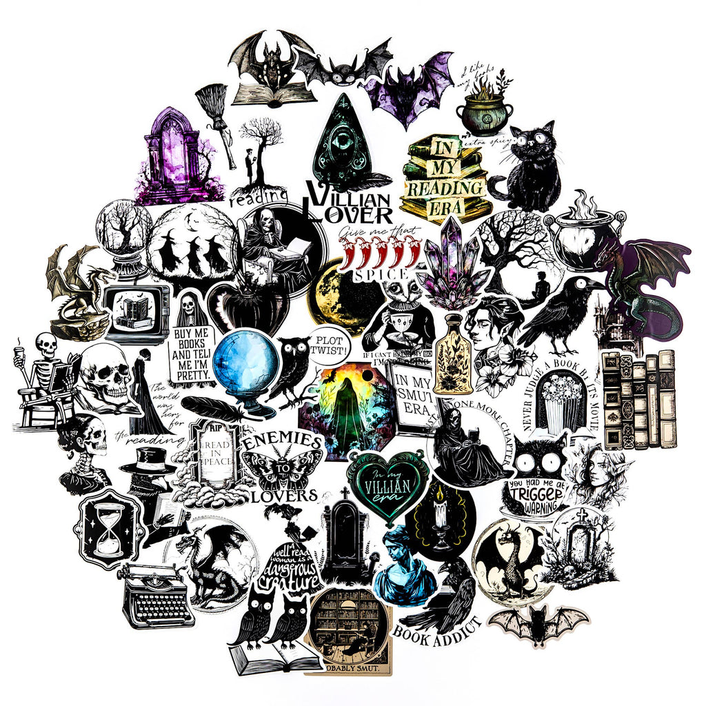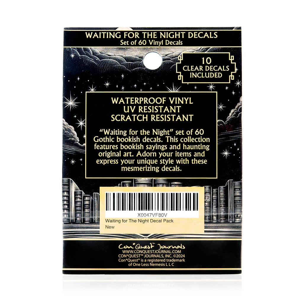 Introducing the Waiting for the Night Decal Pack from Con*Quest Journals featuring bookish sayings and haunting original art, these gothic decals bring captivating motifs of books, bats, cats, ravens, skulls, and more. Crafted from high-grade white vinyl and sealed for superior waterproofing and UV protection, these goth-inspired stickers boast a strong adhesive for long-lasting placement on smooth, hard surfaces. With 60 unique stickers and 10 clear stickers included, ranging in size from 2'' to 3.5'', this pack is perfect for adding a touch of darkness to laptops, phones, cars, gadgets, and more. Perfect for booktok baddies, Kindle girlies, and even just general gothic artwork fans.